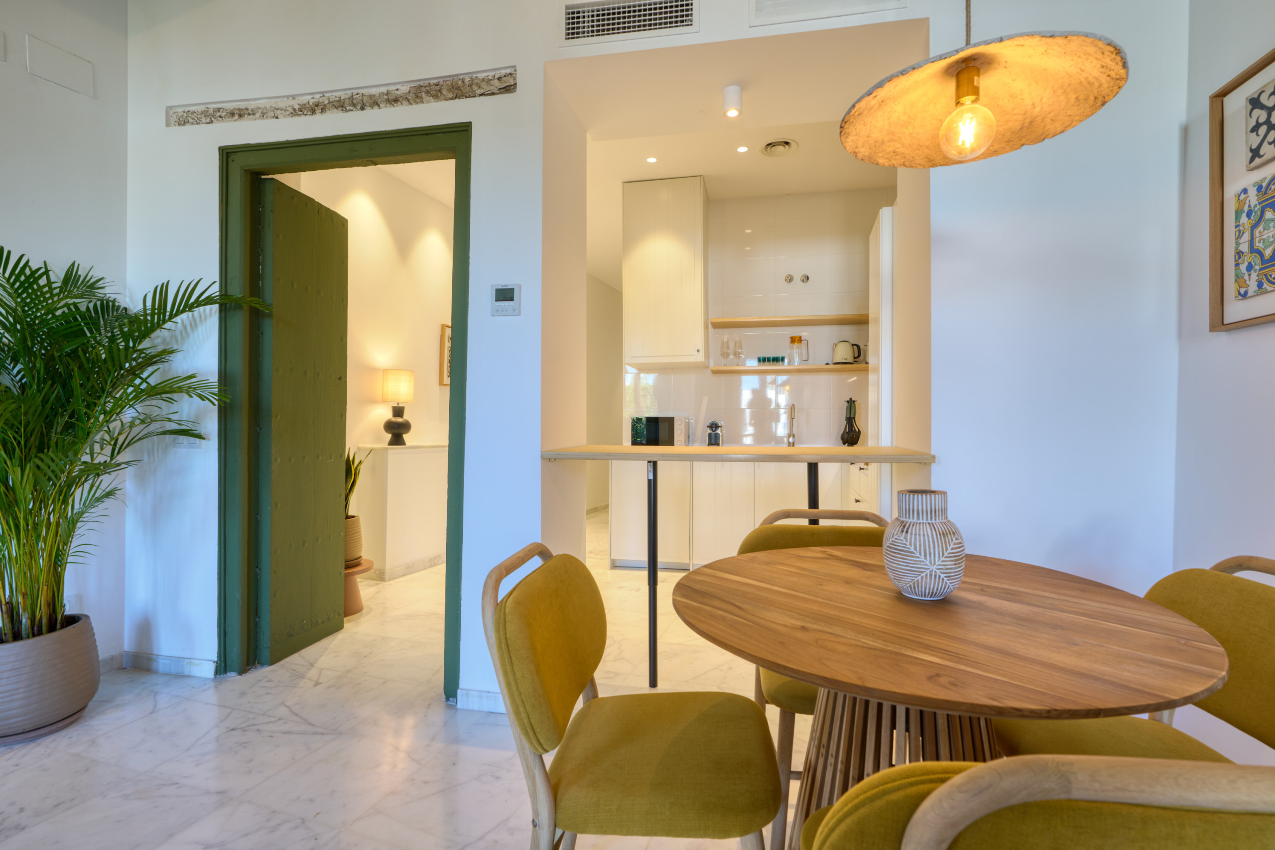 San José IV es uno de los cinco apartamentos independientes del palacio. Situado en la planta baja y con acceso directo desde el patio andaluz, ofrece una experiencia íntima y muy especial: abrir la puerta y encontrarse frente al rumor de la fuente, las columnas romanas y la fresca vegetación del corazón de la casa.