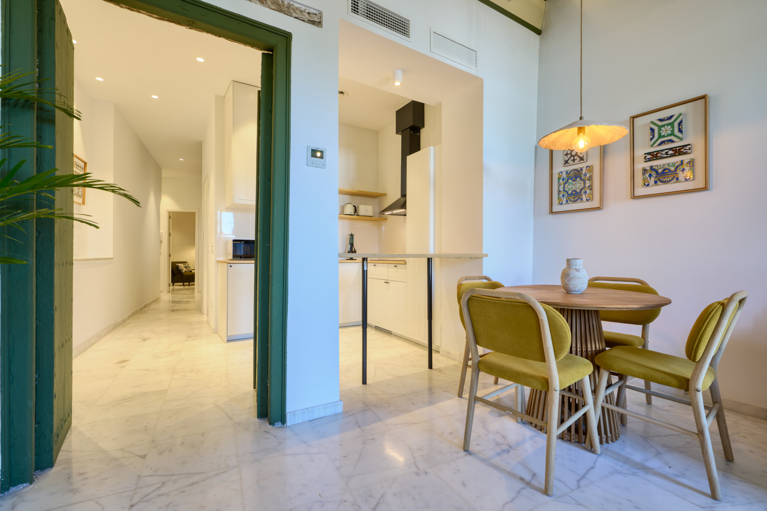 El apartamento recibe al huésped con un salón-comedor luminoso abierto a la cocina. Los suelos de mármol, la altura de los techos, la cerámica artística y el precioso artesonado de la galería ponen de manifiesto la nobleza arquitectónica del edificio.