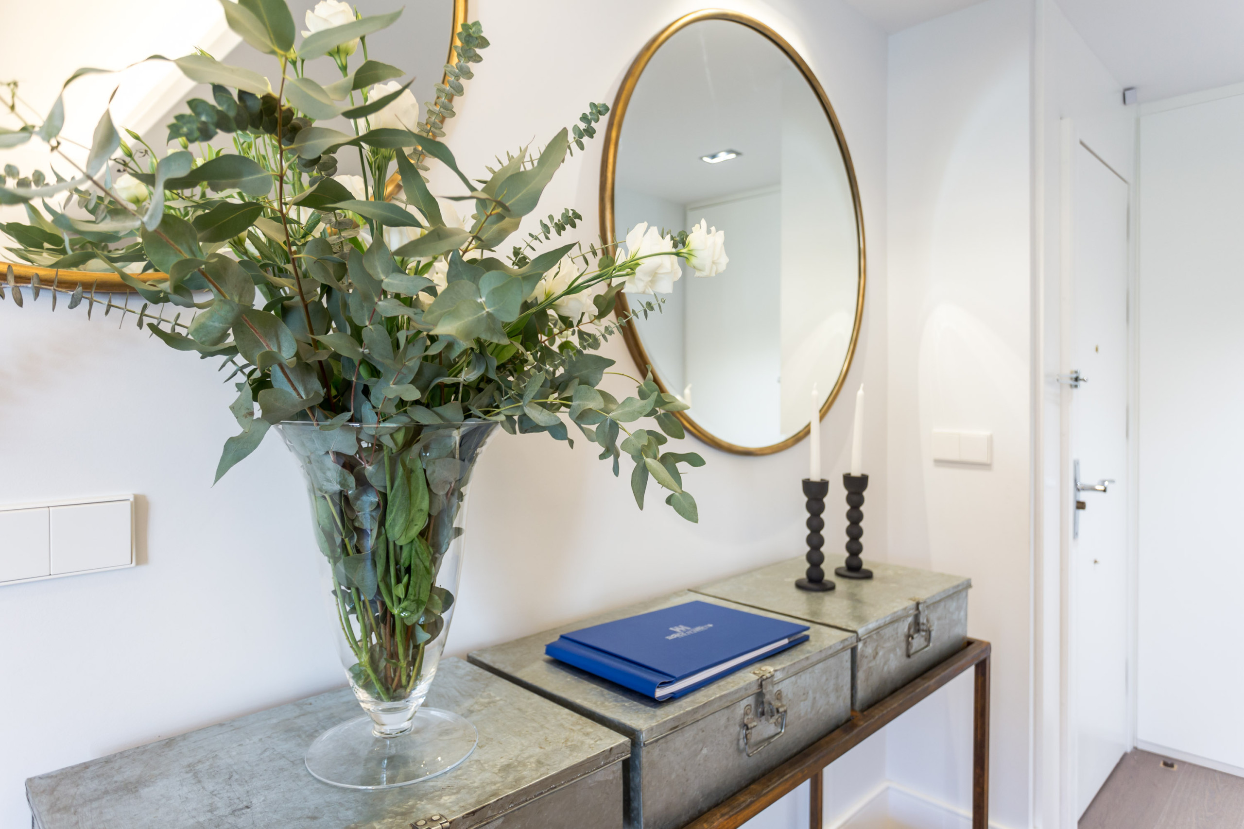 El apartamento recibe al huésped con un salón-comedor luminoso, articulado en un espacio único donde se integra una cocina completa diseñada con ingenio. La decoración combina mobiliario de anticuario, piezas modernas y textiles coloristas que aportan dinamismo y calidez. Los suelos de mármol, la altura de los techos y la carpintería de alta gama recuerdan en cada momento la naturaleza palaciega de la propiedad.