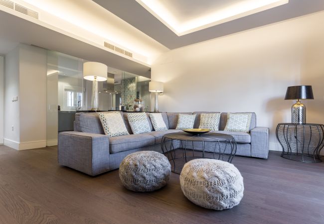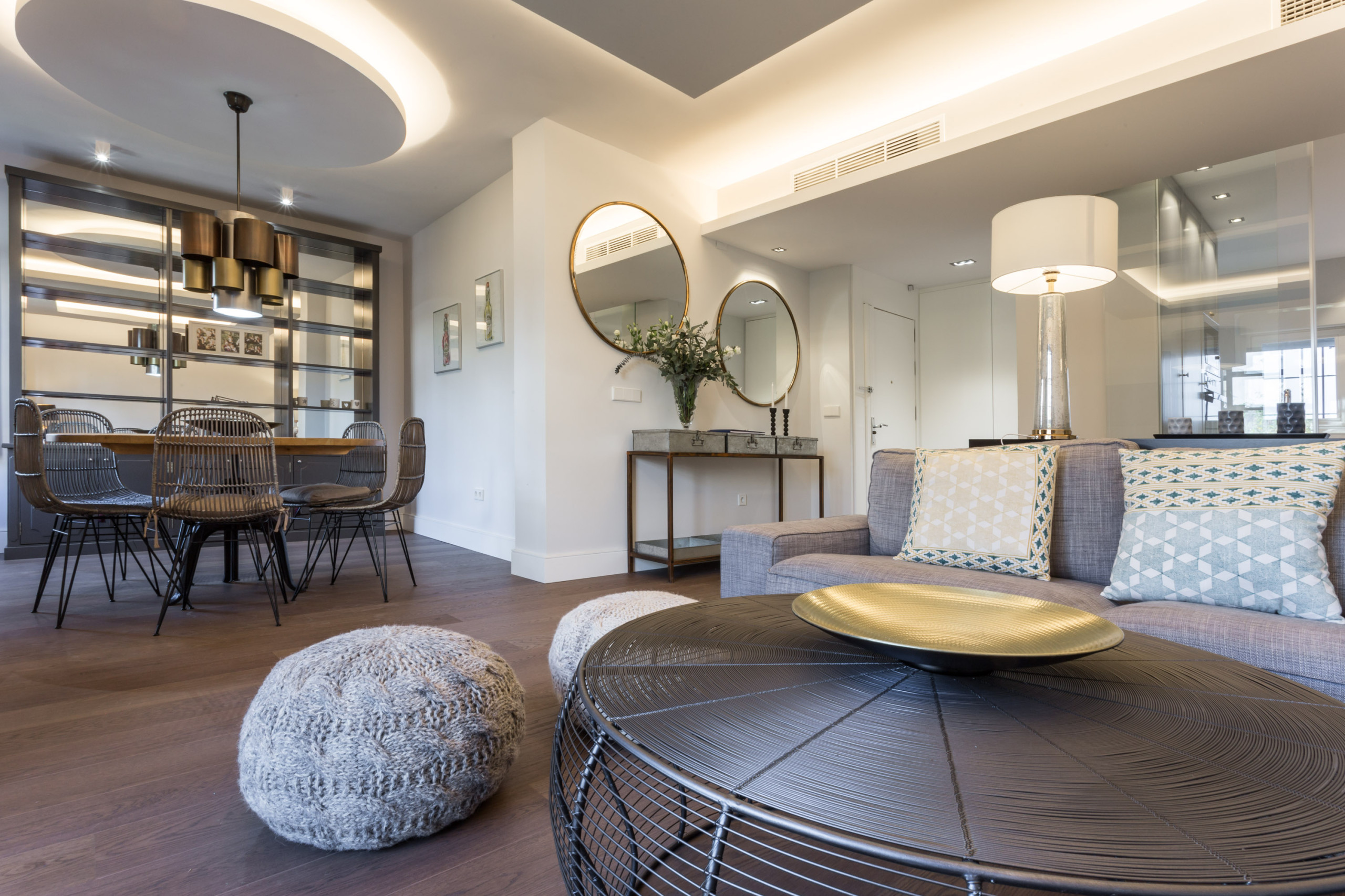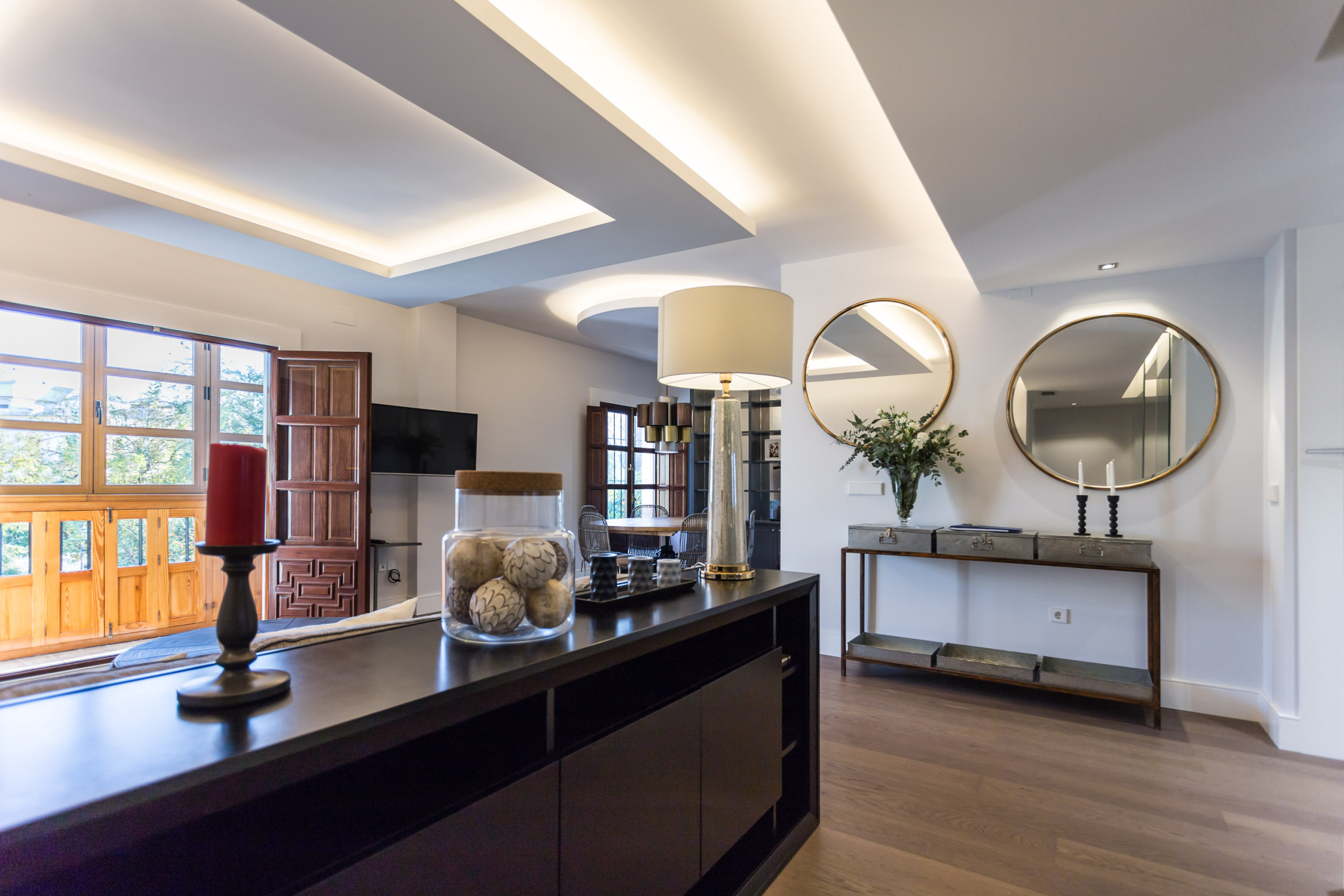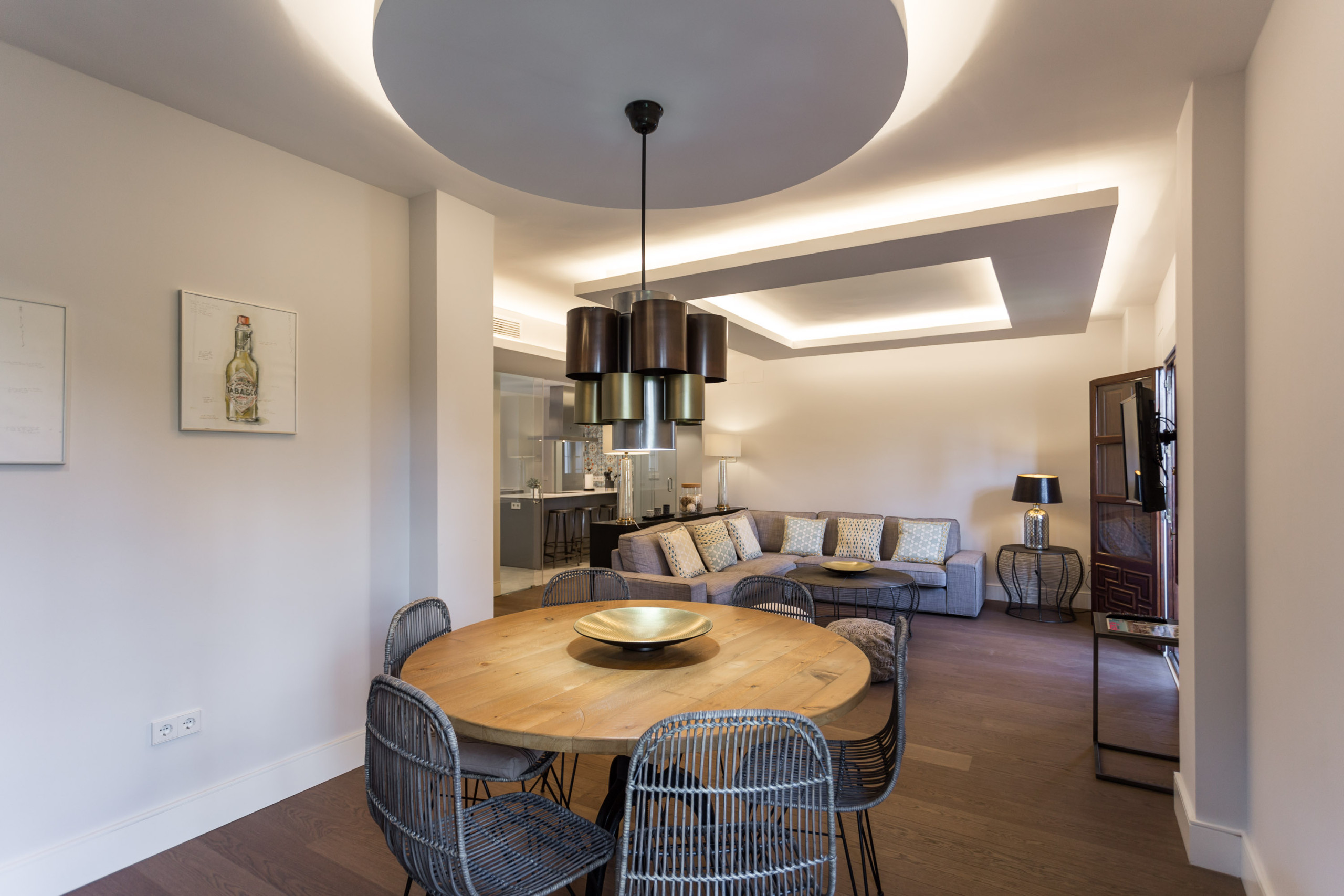 El salón de planta abierta combina dos ambientes diferenciados: zona de estar con cómodo sofá, pufs y luminarias de diseño, y un elegante mini comedor para cuatro personas. Un balcón acristalado con galería da al soleado rincón de la Plaza de los Refinadores.