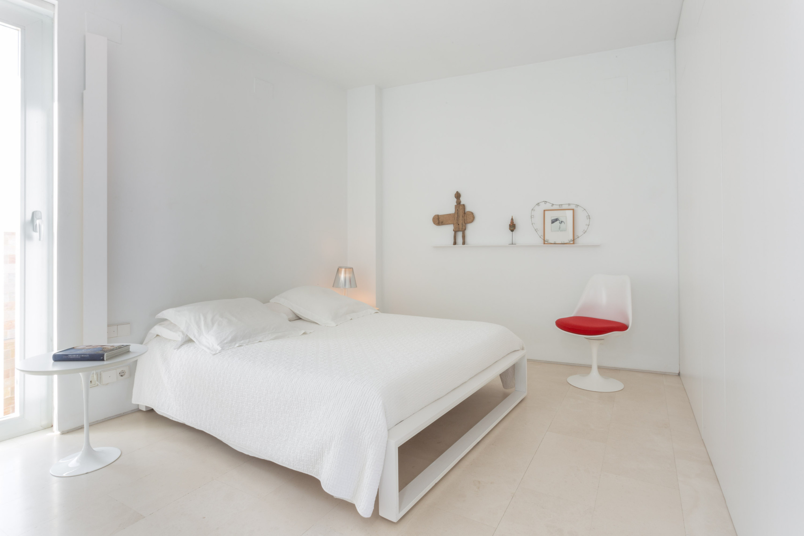 A continuación se encuentra el dormitorio, una estancia encantadora equipada con una cama de 180 × 180 cm, presidida por un delicado trabajo mural en cerámica sevillana. Un bonito armario antiguo de madera aporta carácter y calidez. Al fondo, un baño completo en suite completa la zona de descanso.