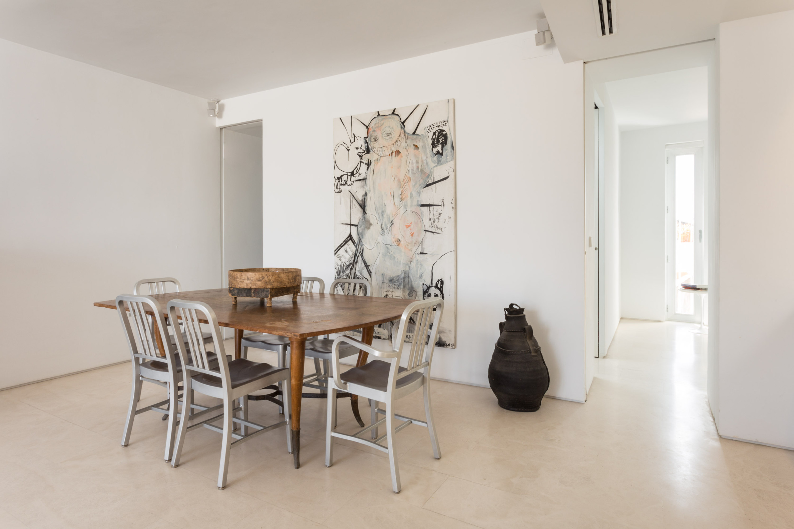 El apartamento recibe al huésped con un salón-comedor luminoso abierto a la cocina. Los suelos de mármol, la altura de los techos, la cerámica artística y el precioso artesonado de la galería ponen de manifiesto la nobleza arquitectónica del edificio.