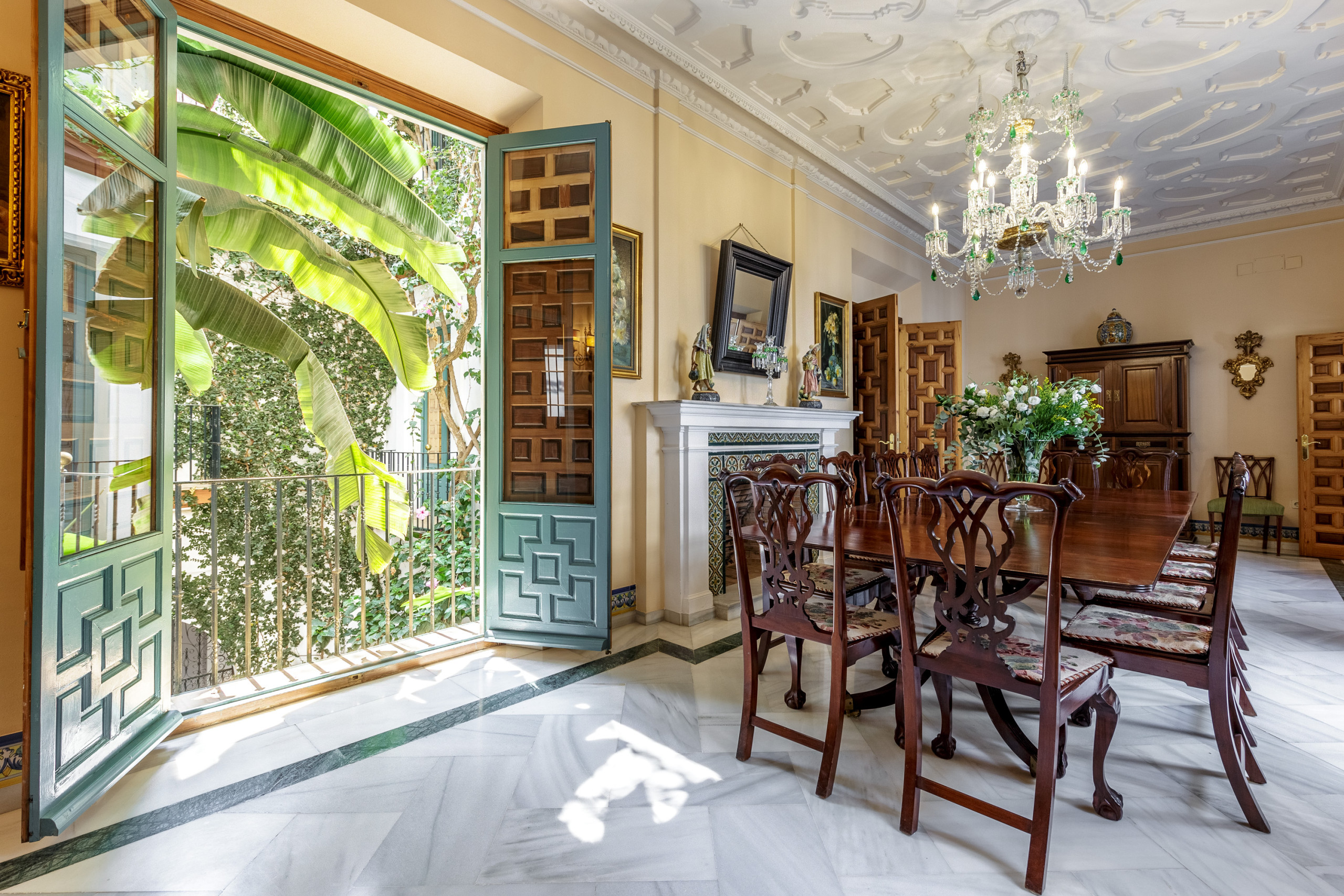 Un gran patio porticado con columnas romanas de mármol, fuentes, estancias porticadas, galerías y exuberantes terrazas configuran un entorno único. En el interior, una auténtica exhibición de artesanía: artesonados, carpinterías nobles, azulejería clásica, molduras barrocas y una colección excepcional de mobiliario y antigüedades seleccionadas por los propietarios.