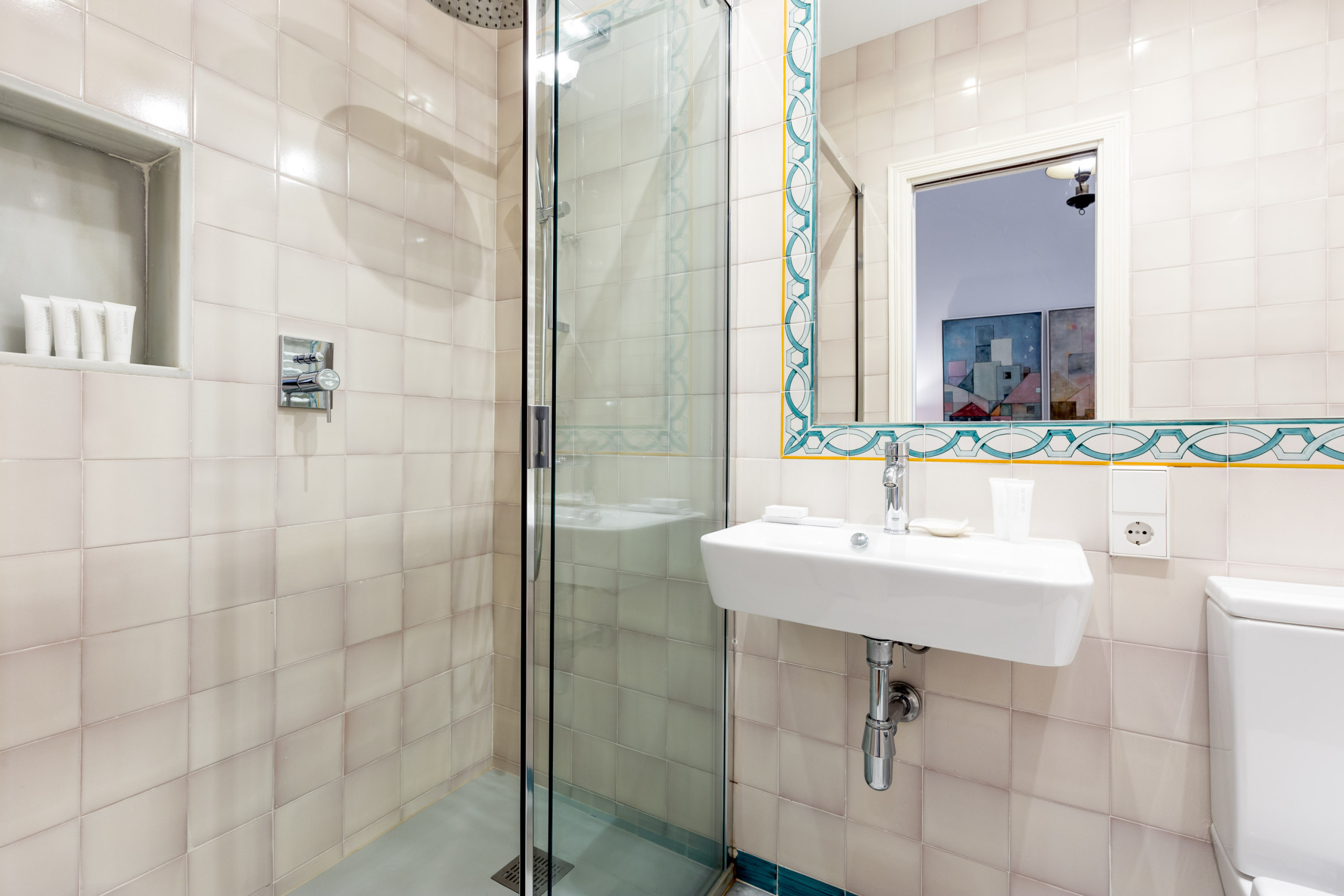 El apartamento recibe al huésped con un salón-comedor luminoso, articulado en un espacio único donde se integra una cocina completa diseñada con ingenio. La decoración combina mobiliario de anticuario, piezas modernas y textiles coloristas que aportan dinamismo y calidez. Los suelos de mármol, la altura de los techos y la carpintería de alta gama recuerdan en cada momento la naturaleza palaciega de la propiedad.