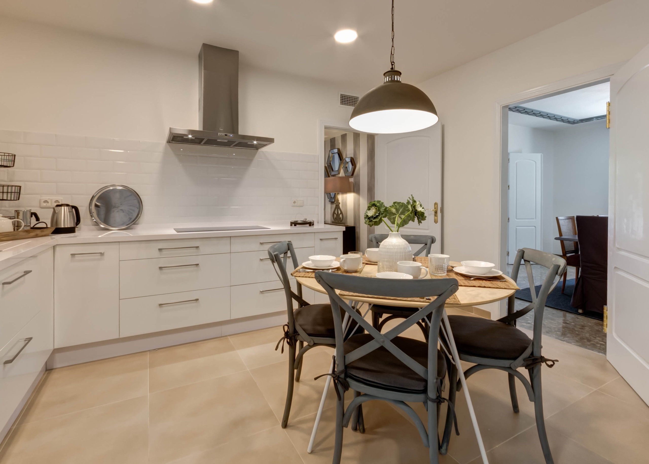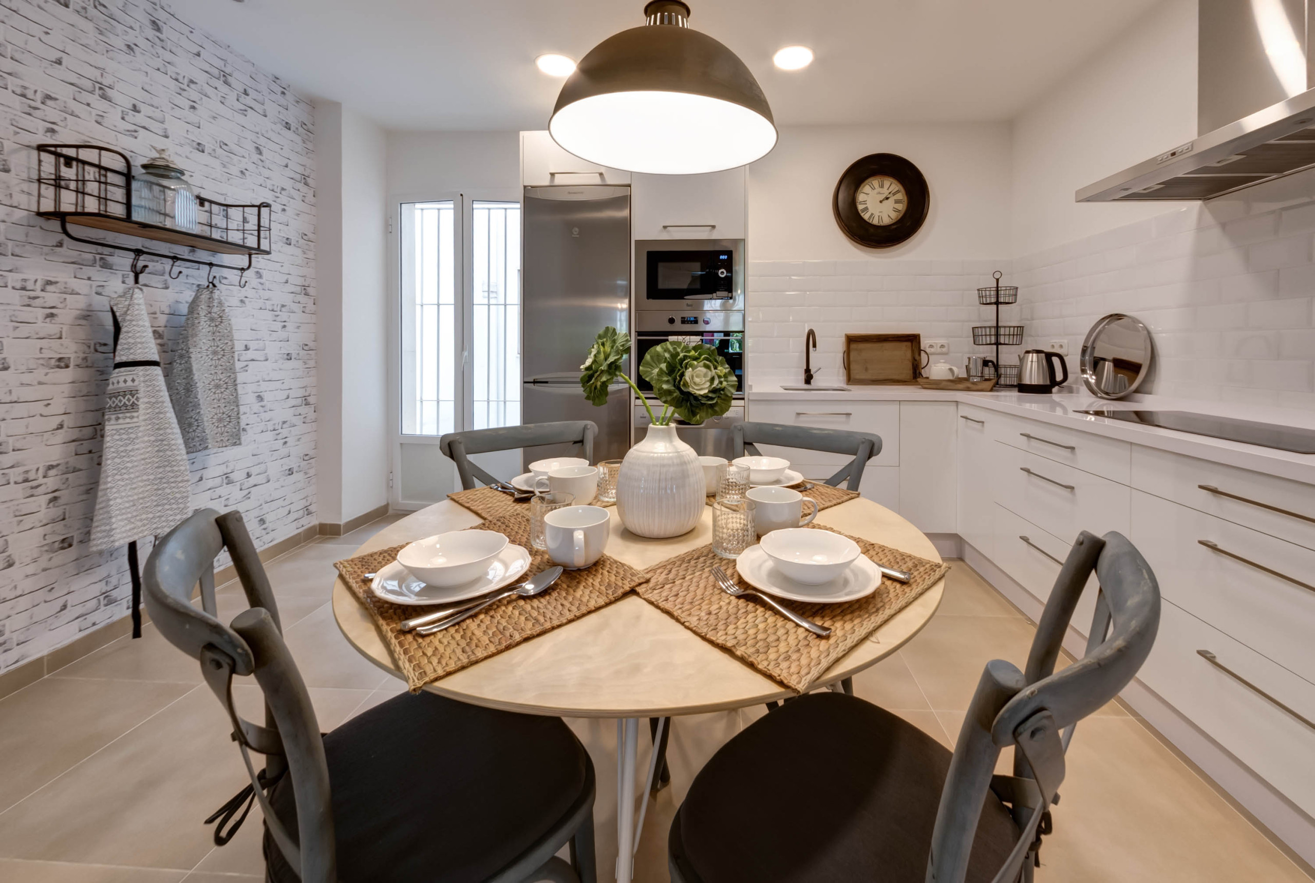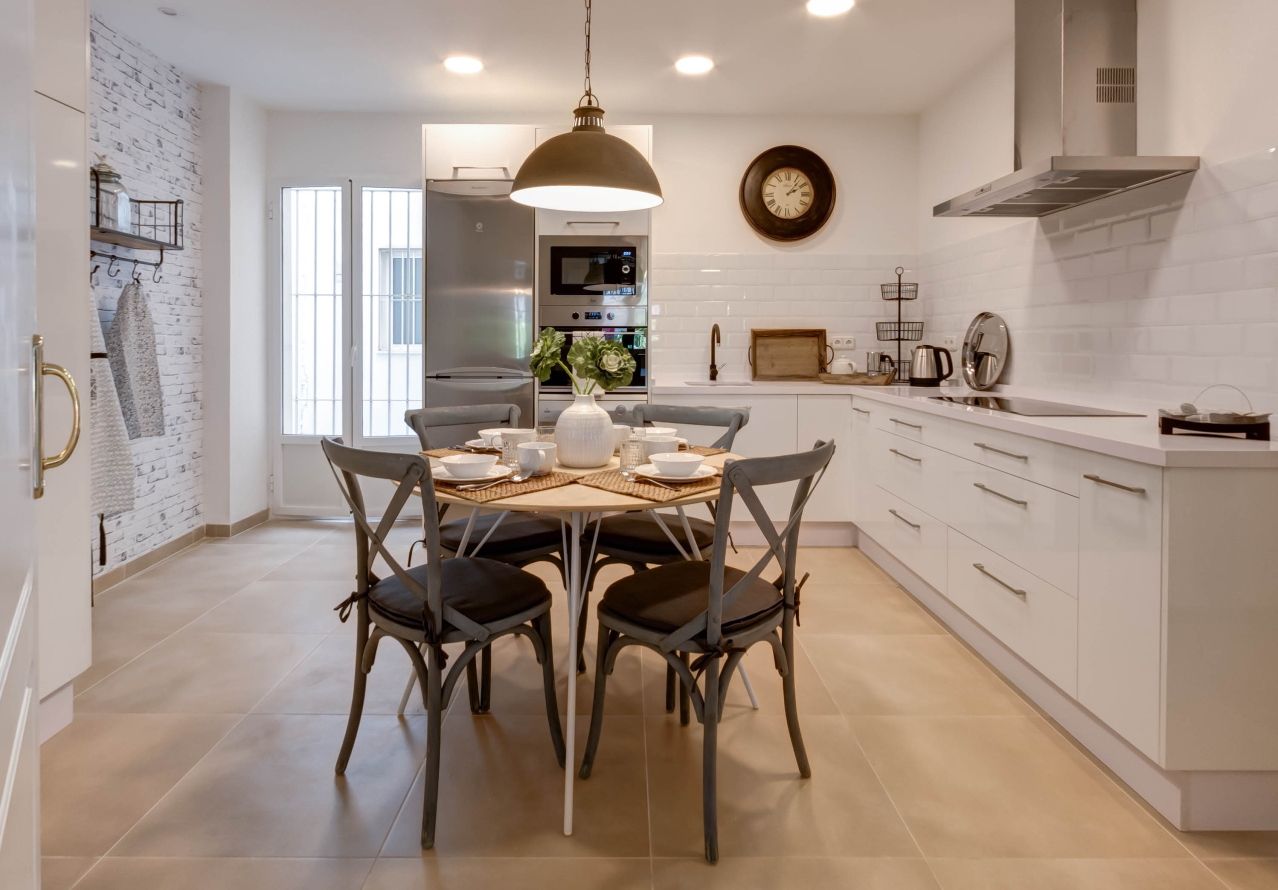 The kitchen, modern and equipped, combines furniture in white with vintage details and a cosy breakfast area.