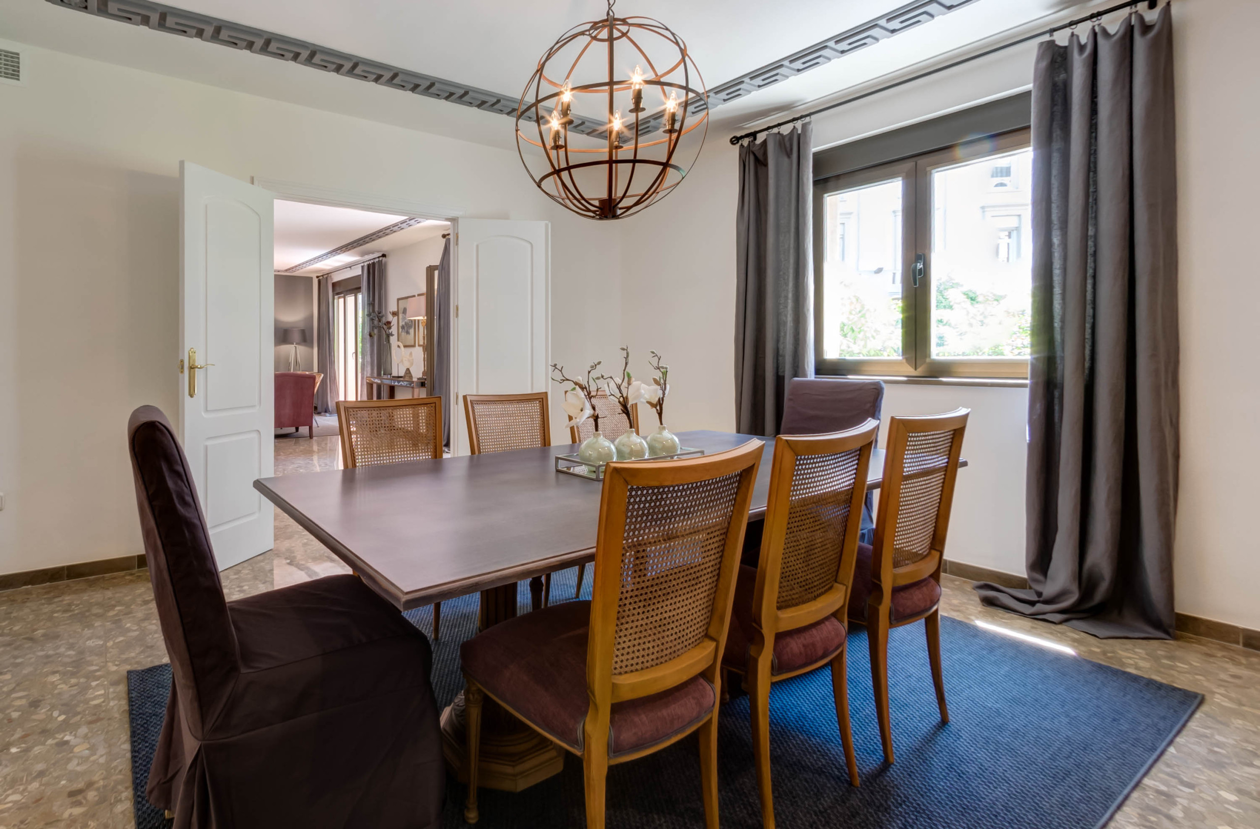 Through a wide opening, one accesses the independent dining room, elegant and perfect for long group meals.