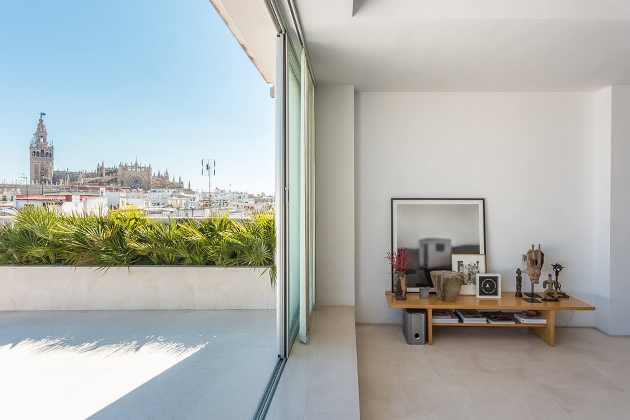 Light, space, views, location. All of these are essential elements for the perfect house, and this two-bedroom penthouse apartment boasts them all. It is located in the Barrio del Arenal, on the banks of the Guadalquivir river, next to the Maestranza bullring, just a five minute walk from the Giralda and the very traditional Triana district. Here’s where Seville’s many faces –its monuments, tourist attractions, cultural venues, financial district– come together.