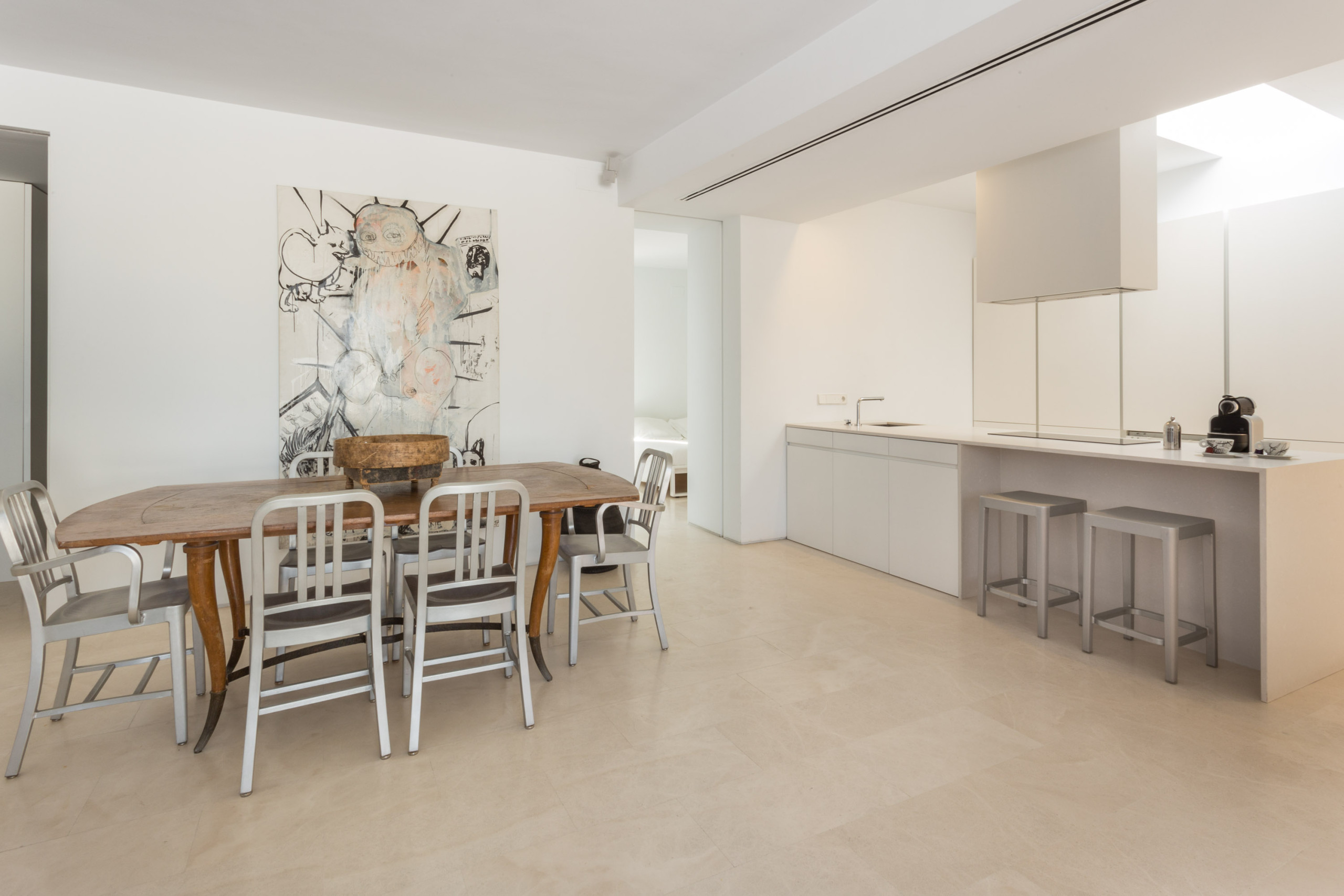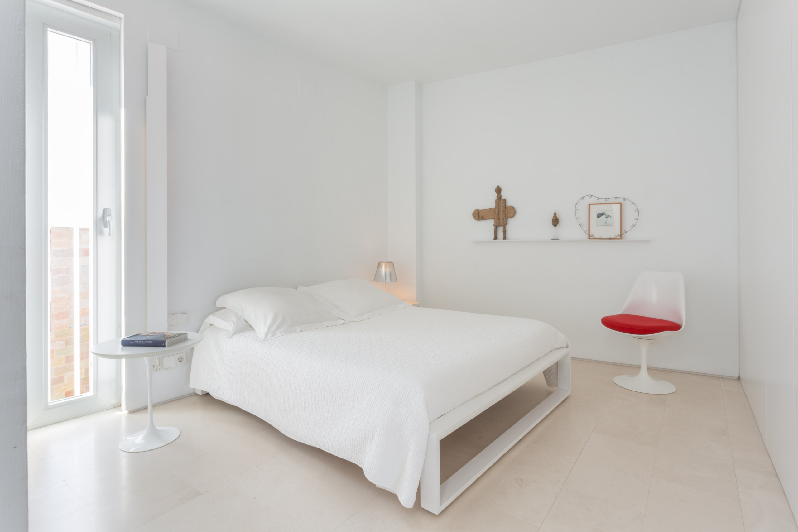 The minimalist and conceptual décor is based on chosen classics of twentieth-century design, both striking and functional. But the main element is the pervasive colour white. The stark walls create a serene atmosphere which provides a contrast to the bustling neighbourhood in which this apartment sits. The most important date for this area is the week of the Seville Fair, held in April each year, for which the neighbouring Maestranza bullring is the ultimate meeting point. But not to worry: in addition to its high quality finishings, the apartment has been fitted with air conditioning and is excellently soundproofed.